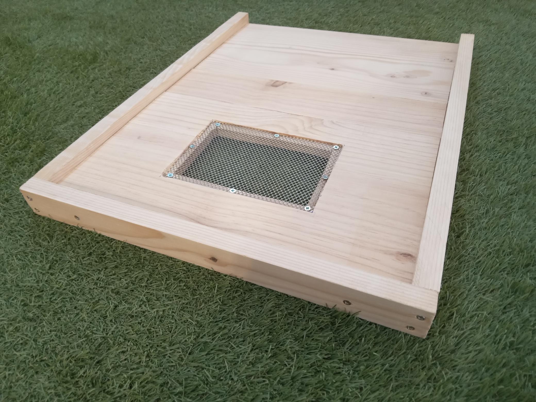 La planche d’envol permet aux abeilles d’atterrir et de décoller. La grille inox est une aération qui permet de conserver un bon taux d’humidité, favorable à la production de miel.